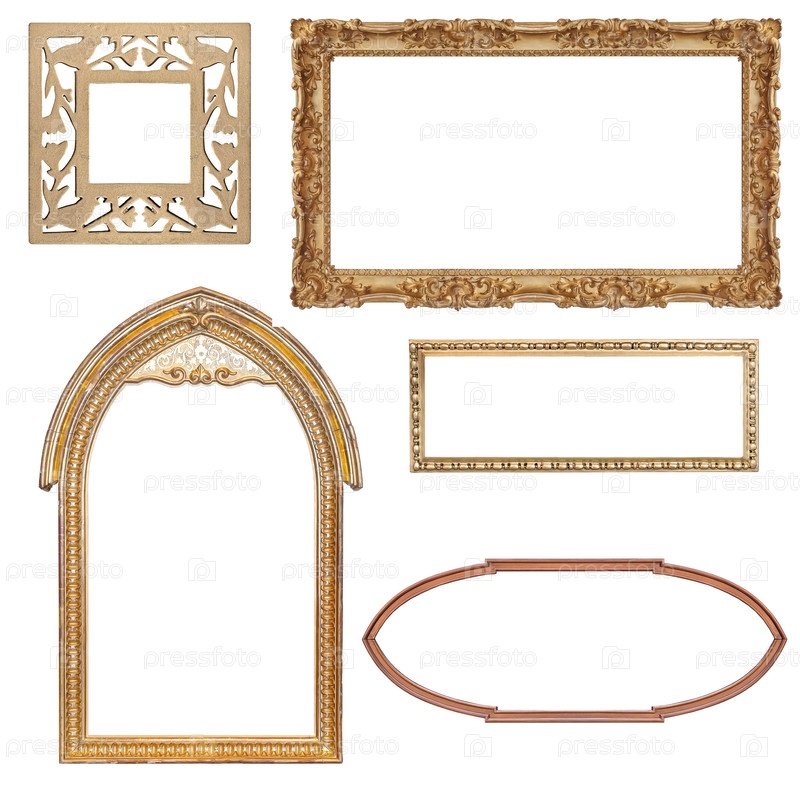 Набор золотых рамок для картин, зеркал или фотографий, изолированных на белом фоне