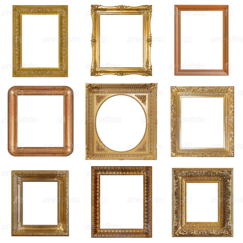 Набор золотых рамок для картин, зеркал или фотографий, изолированных на белом фоне