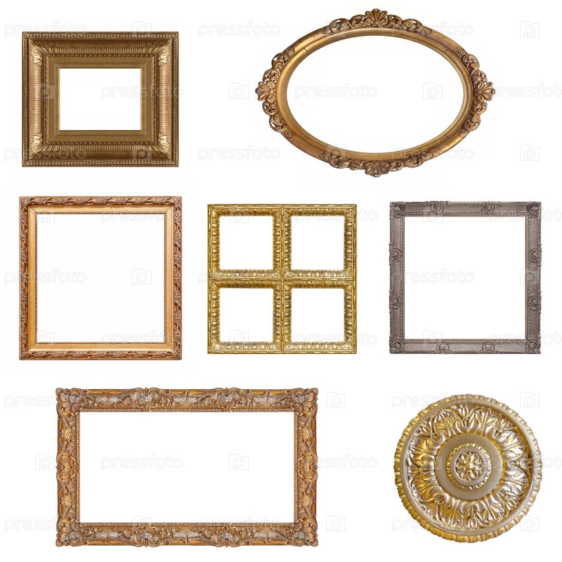 Набор золотых рамок для картин, зеркал или фотографий, изолированных на белом фоне