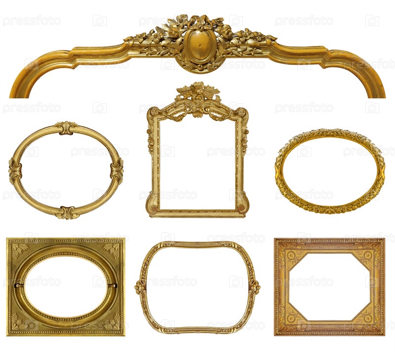 Набор золотых рамок для картин, зеркал или фотографий, изолированных на белом фоне