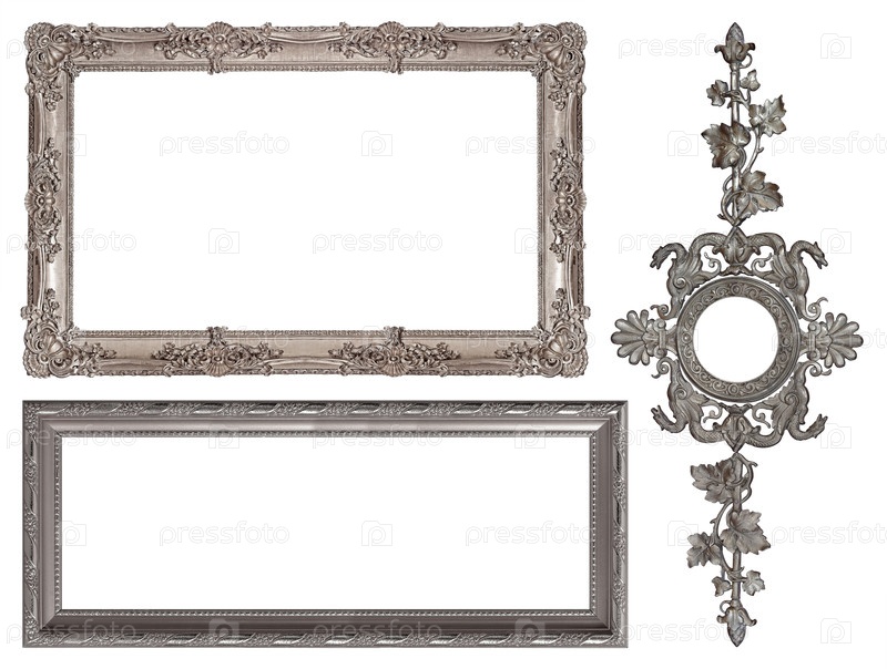 Набор серебряных рамок для картин, зеркал или фотографий изолированный на белом фоне