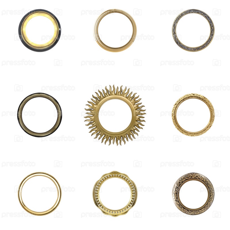 Набор золотых рамок для картин, зеркал или фотографий, изолированных на белом фоне