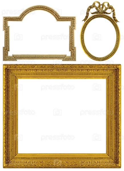 Набор золотых рамок для картин, зеркал или фотографий, изолированных на белом фоне