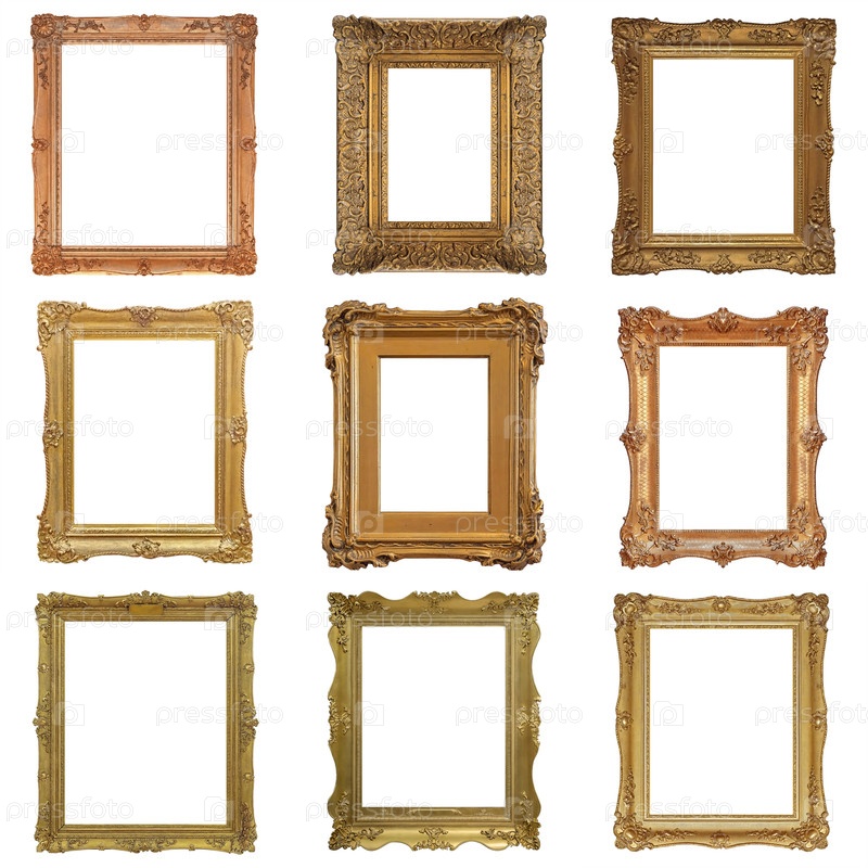 Набор золотых рамок для картин, зеркал или фотографий, изолированных на белом фоне
