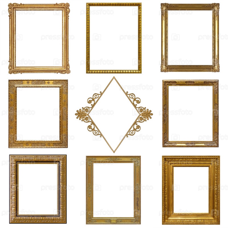 Набор золотых рамок для картин, зеркал или фотографий, изолированных на белом фоне