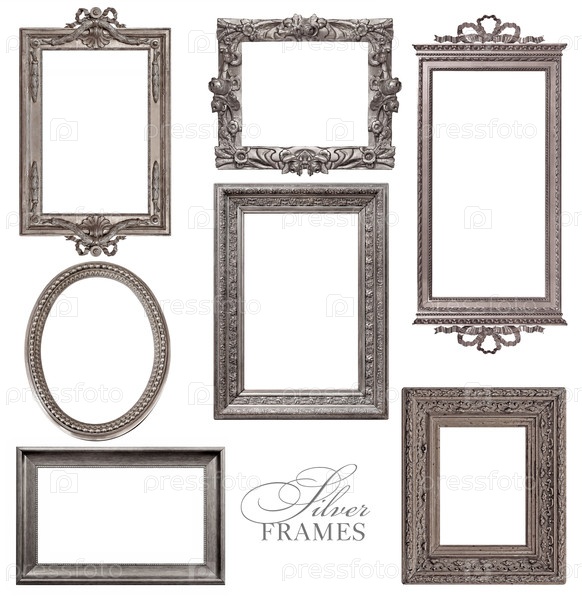 Набор серебряных рамок для картин, зеркал или фотографий изолированный на белом фоне