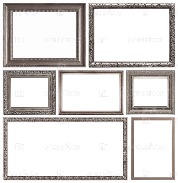 Набор серебряных рамок для картин, зеркал или фотографий изолированный на белом фоне