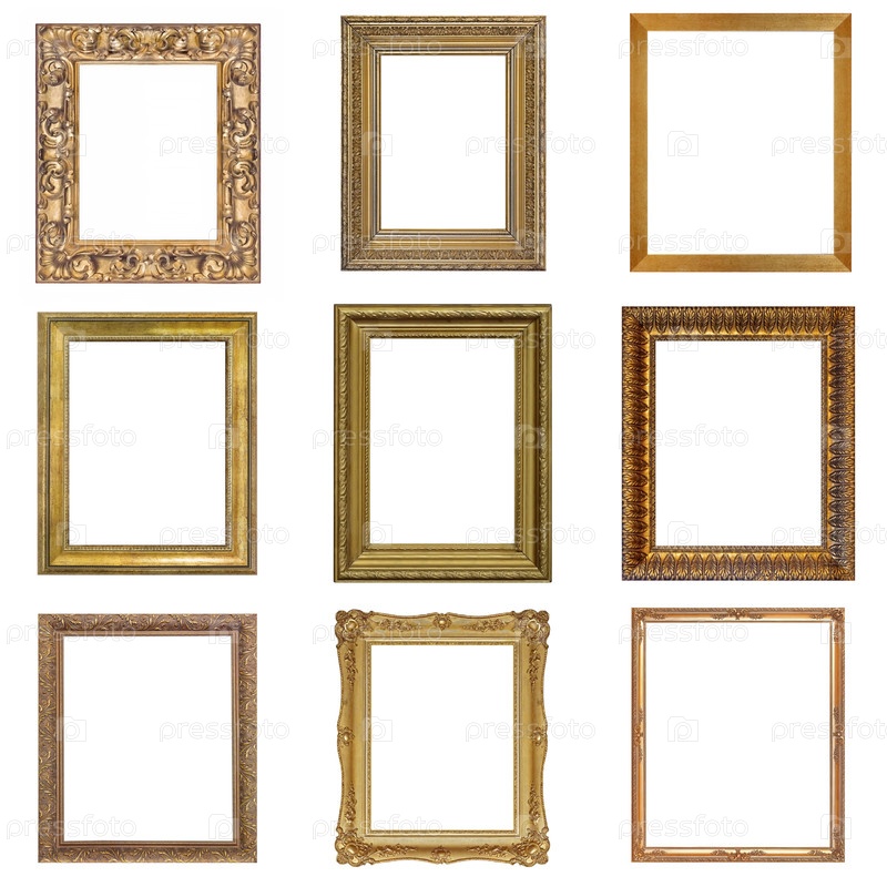 Набор золотых рамок для картин, зеркал или фотографий, изолированных на белом фоне