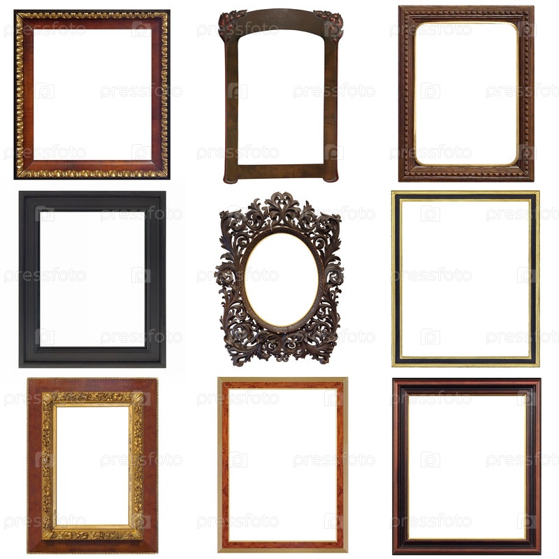 Набор золотых рамок для картин, зеркал или фотографий, изолированных на белом фоне
