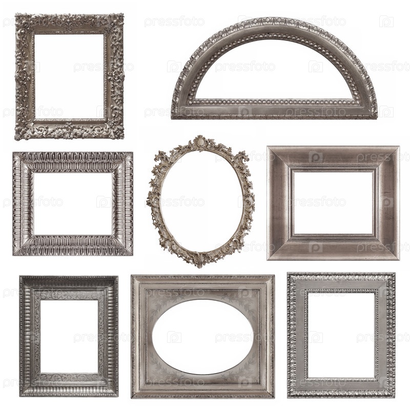 Набор серебряных рамок для картин, зеркал или фотографий изолированный на белом фоне