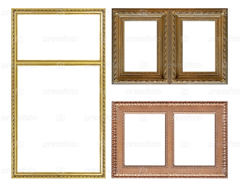 Набор золотых рамок для картин, зеркал или фотографий, изолированных на белом фоне