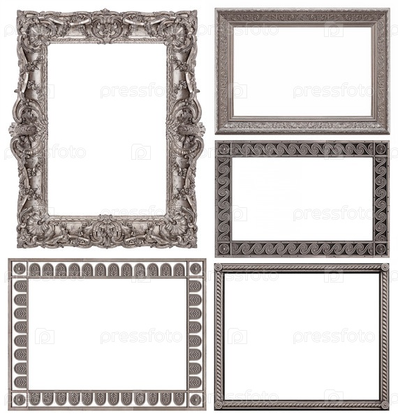 Набор серебряных рамок для картин, зеркал или фотографий изолированный на белом фоне