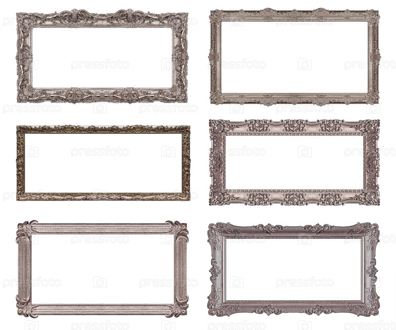 Набор панорамных серебряных рамок для картин, зеркал или фотографий, изолированных на белом фоне