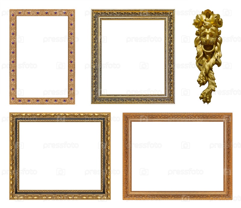 Набор золотых рамок для картин, зеркал или фотографий, изолированных на белом фоне