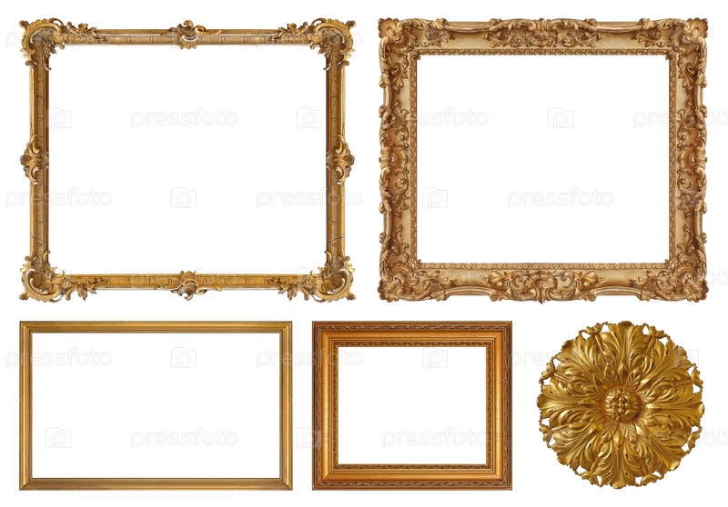 Набор золотых рамок для картин, зеркал или фотографий, изолированных на белом фоне