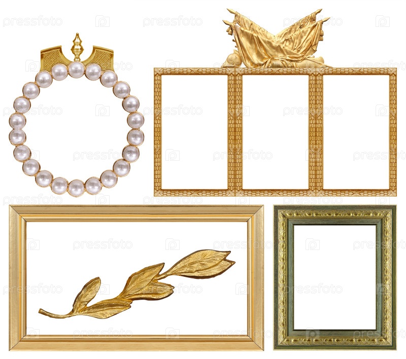 Набор золотых рамок для картин, зеркал или фотографий, изолированных на белом фоне
