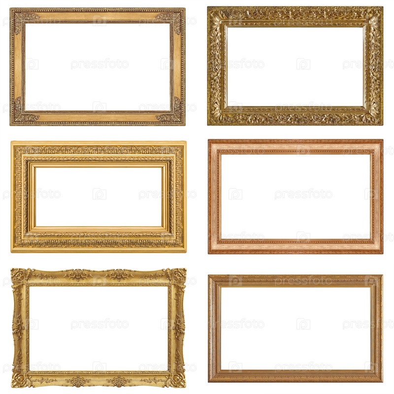 Набор золотых рамок для картин, зеркал или фотографий, изолированных на белом фоне