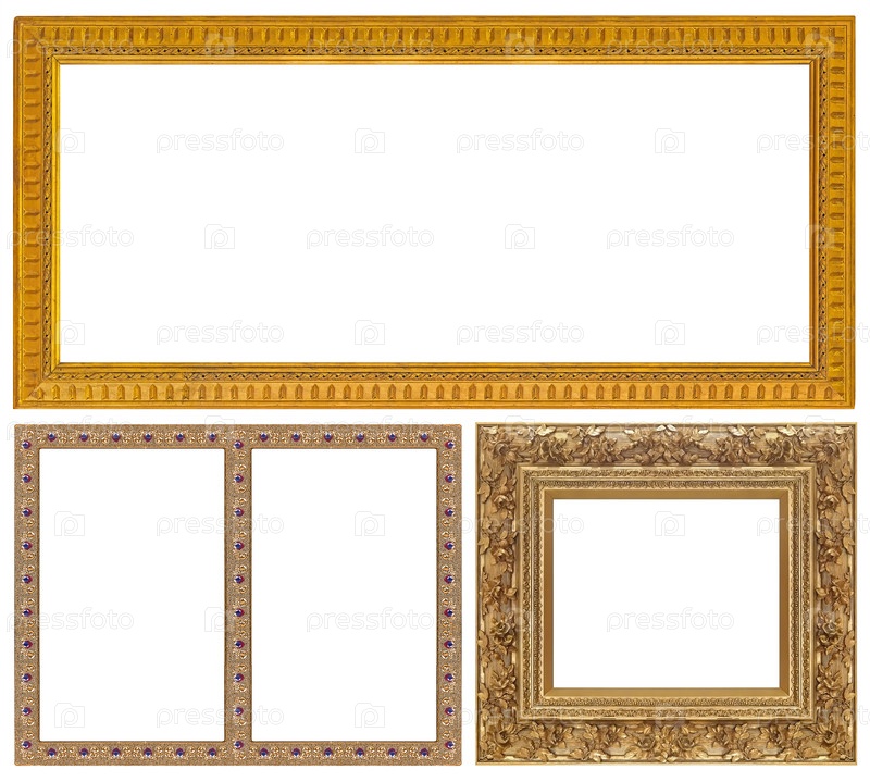 Набор золотых рамок для картин, зеркал или фотографий, изолированных на белом фоне