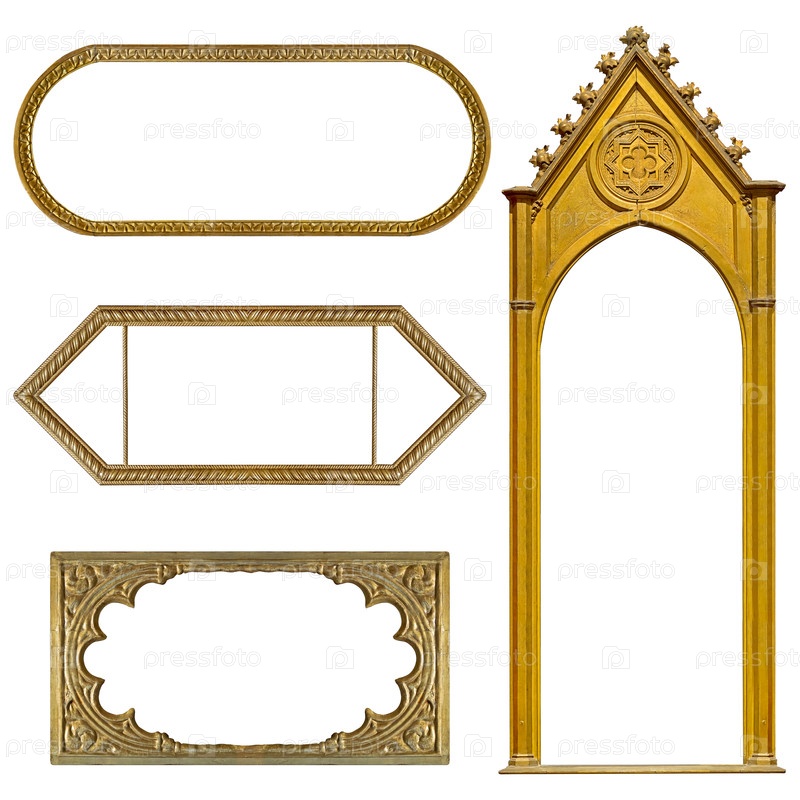 Набор золотых рамок для картин, зеркал или фотографий, изолированных на белом фоне