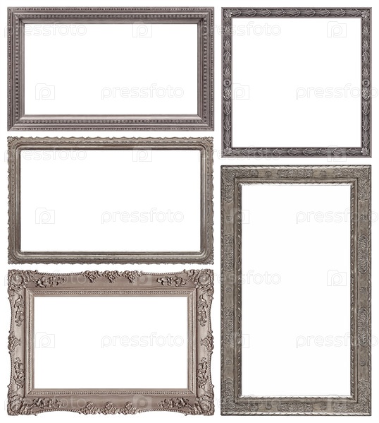 Набор серебряных рамок для картин, зеркал или фотографий изолированный на белом фоне