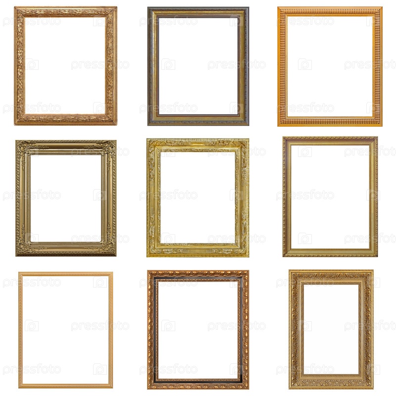 Набор золотых рамок для картин, зеркал или фотографий, изолированных на белом фоне