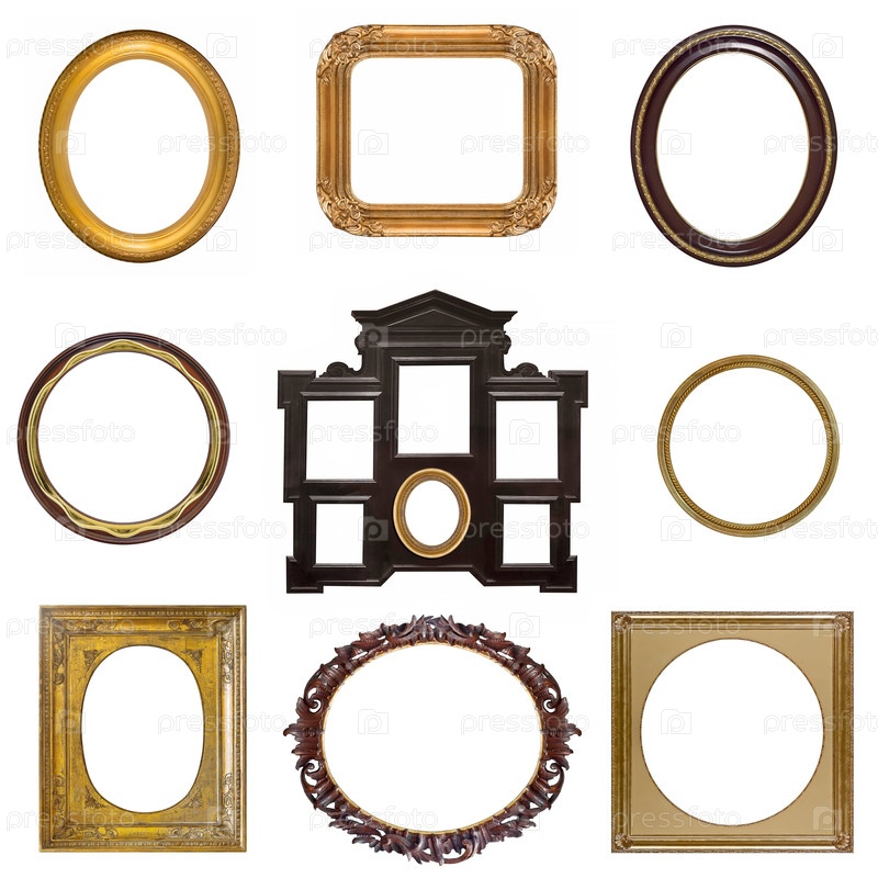 Набор золотых рамок для картин, зеркал или фотографий, изолированных на белом фоне