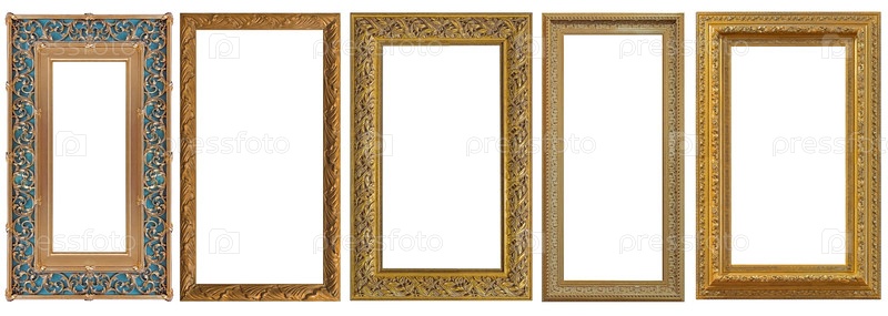 Набор золотых рамок для картин, зеркал или фотографий, изолированных на белом фоне