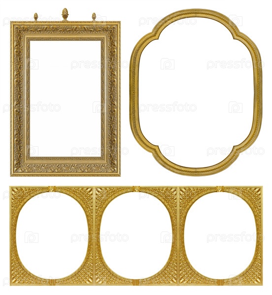 Набор золотых рамок для картин, зеркал или фотографий, изолированных на белом фоне