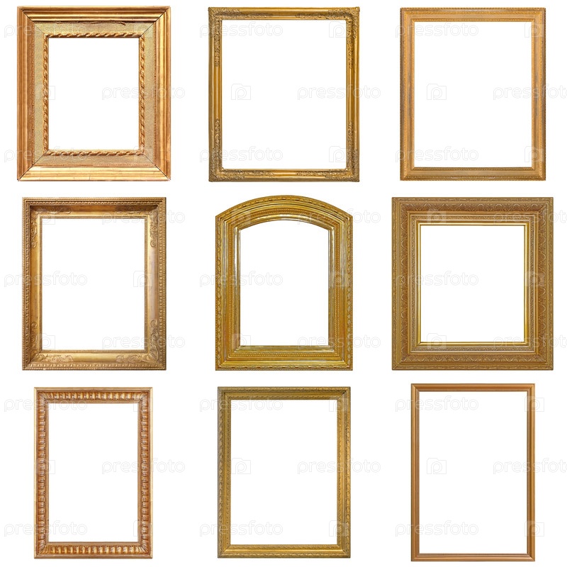 Набор золотых рамок для картин, зеркал или фотографий, изолированных на белом фоне