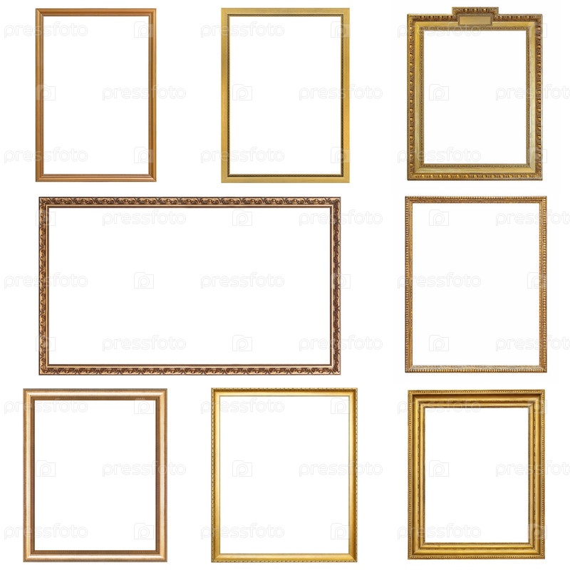 Набор золотых рамок для картин, зеркал или фотографий, изолированных на белом фоне