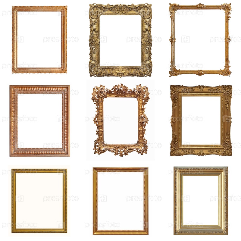 Набор золотых рамок для картин, зеркал или фотографий, изолированных на белом фоне