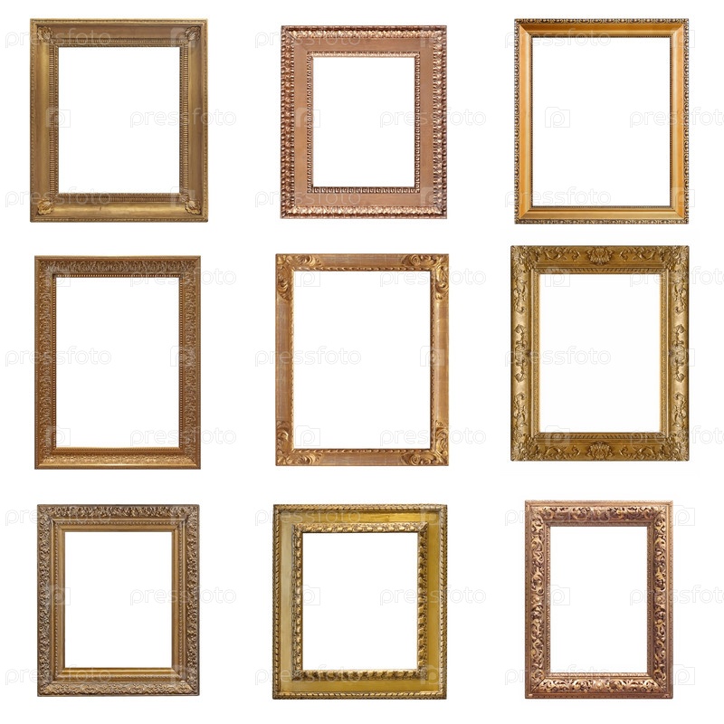 Набор золотых рамок для картин, зеркал или фотографий, изолированных на белом фоне