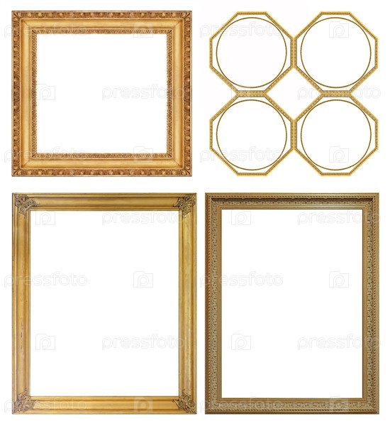 Набор золотых рамок для картин, зеркал или фотографий, изолированных на белом фоне