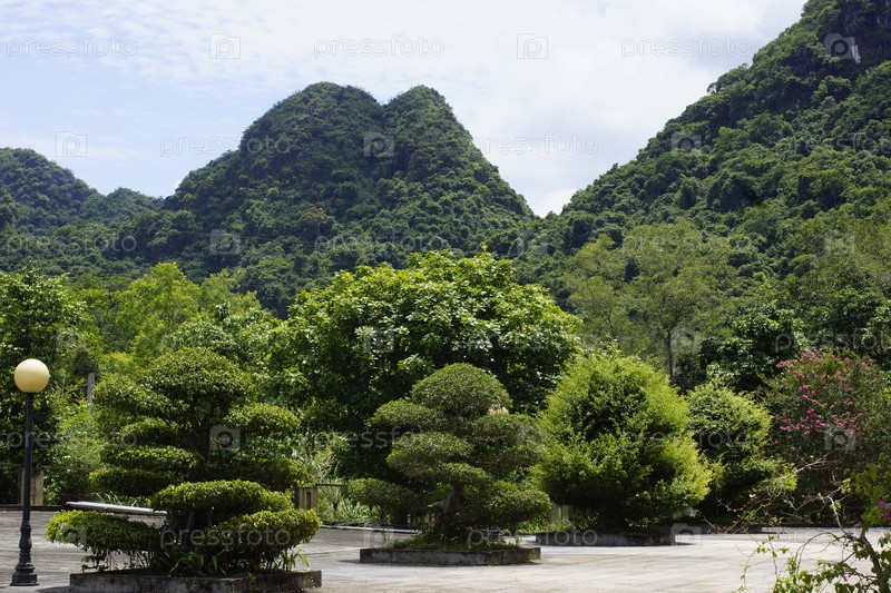 Территория администрации заповедника Катба, Вьетнам, на фоне скал, покрытых лесом