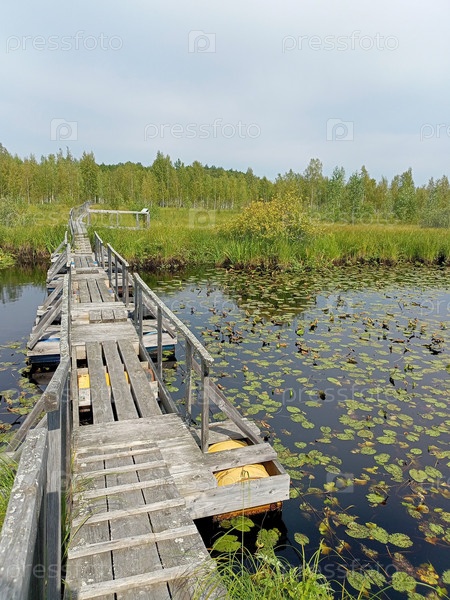 Деревянный мост через заболоченную неглубокую речку экотропа Плавницкое болото Полистовский заповедник