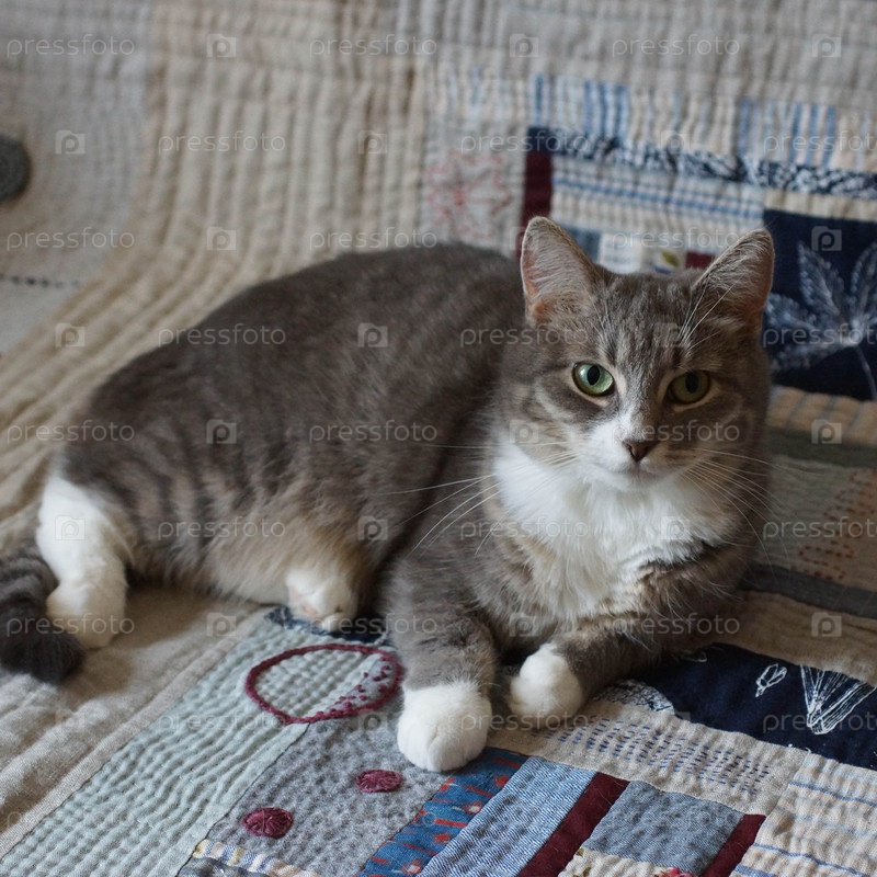Серая домашняя кошка на стеганом одеяле