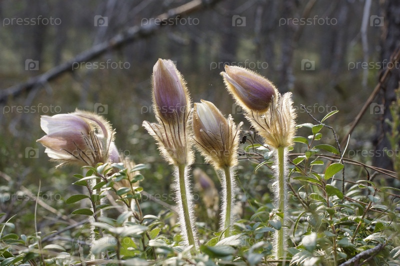 Полянка цветущие прострелы сон-трава в пасмурную погоду
