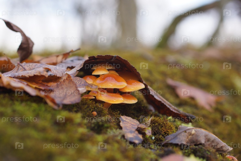Группа плодовых тел съедобного гриба опенок зимний (фламулина бархастиножковая)