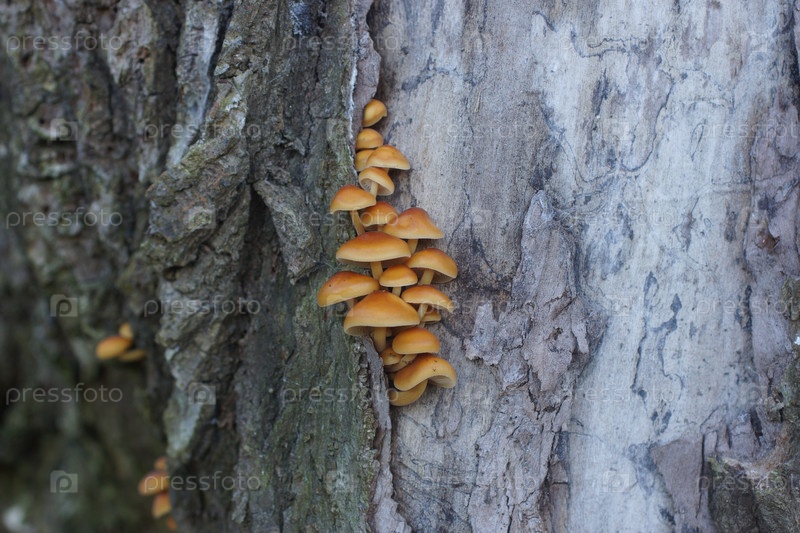 Группа плодовых тел съедобного гриба опенок зимний (фламулина бархастиножковая)