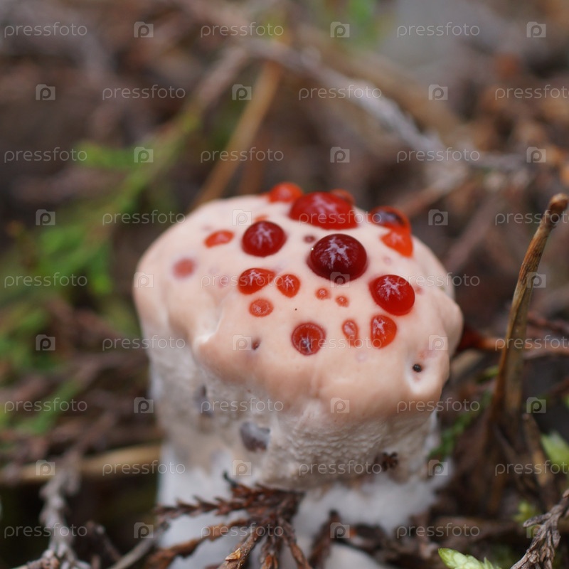 Молодое плодовое тело гриба гиджнеллум ржавчинный с красными каплями