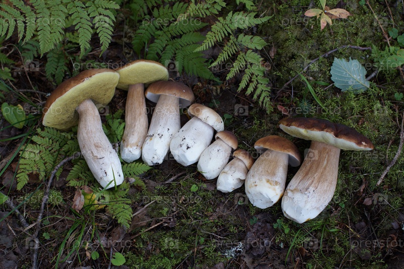 Ряд белых грибов на земле