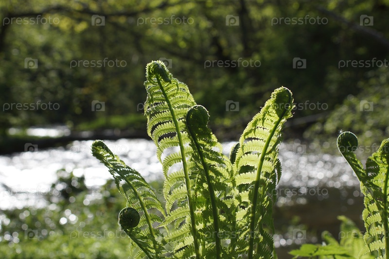 Молодые листья папоротников на фоне залитого солнцем ручья
