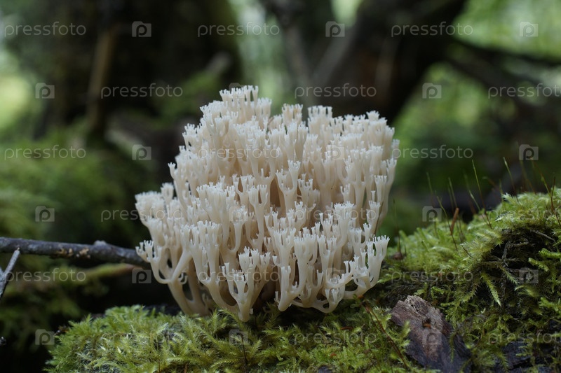 Гриб рогатик артомицес крыночковидный на замшелом валеже