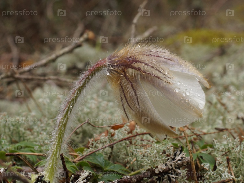 Цветущий прострел сон-трава в дождь