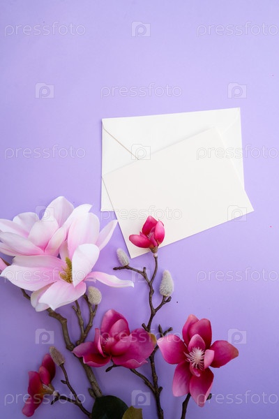 Цветущая розовая ветвь магнолии с цветами на фиолетовом фоне, копирование пространства