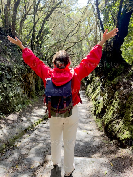 Одинокий ходящий по солнечной лесной тропе, держа Библию, красную куртку, лучи фильтруют через деревья, пятнистый свет, пылевые мотылки, созерцательное настроение, тихая поездка