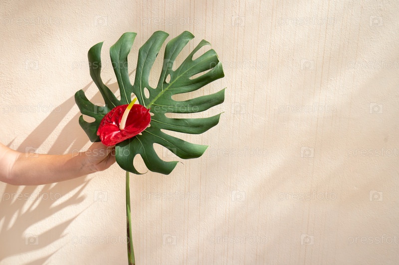 Рука держит тропические листья зелени с зелеными листами и красными цветами антуриума