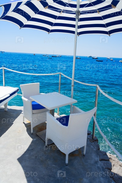 Стулья под зонтиком, красивые детали побережья Позитано, итальянский курорт, Италия