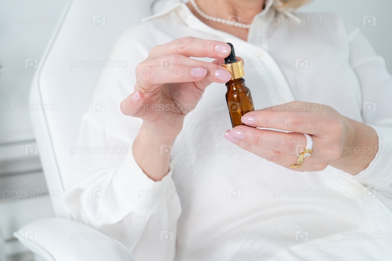 Женщина берется осторожно открыть маленькую янтарную бутылку с эфирным маслом, предназначенную для успокаивающей ароматерапии