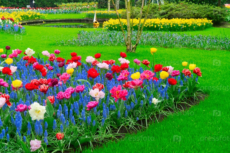 Путь через яркий сад тюльпанов в полном цветении во время восхитительного весеннего сезона захватывает дух